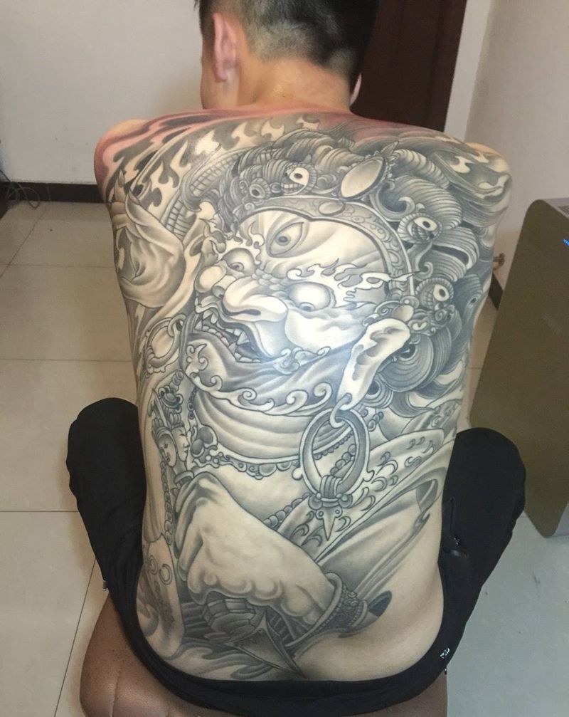 当前位置: 首页 >河南省郑州市纹身店-大孟刺青工作室纹身图案>满背黑天纹身图片_成品背部传统鬼神原创纹身图案