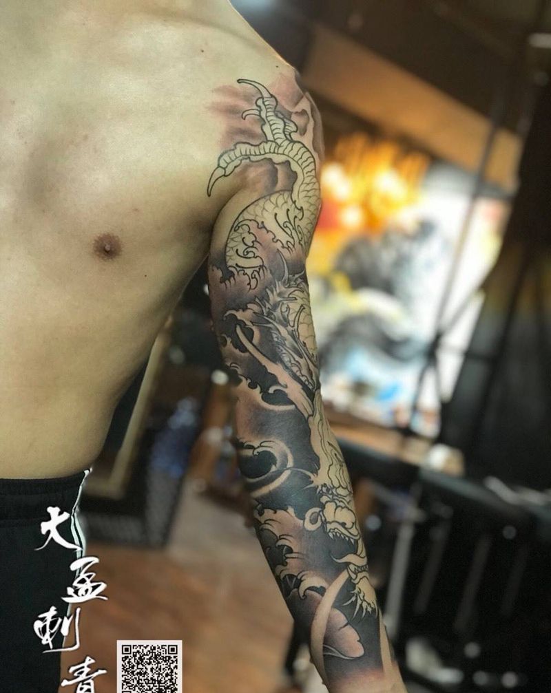当前位置: 首页 >河南省郑州市纹身店-大孟刺青工作室纹身图案>花臂龙未完待续纹身图片_成品原创传统纹身图案