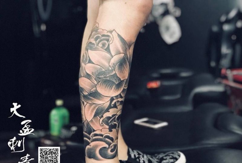 当前位置: 首页 >河南省郑州市纹身店-大孟刺青工作室纹身图案>荷花水浪包小腿纹身图片_成品传统原创纹身图案