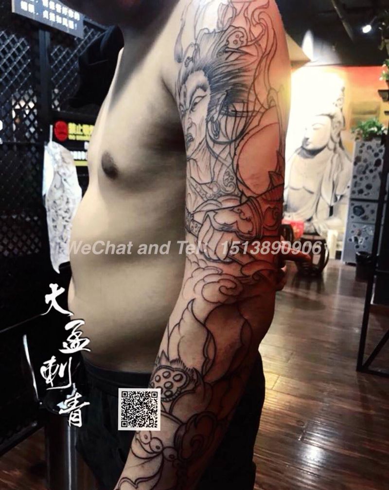 当前位置: 首页 >河南省郑州市纹身店-大孟刺青工作室纹身图案>二郎神荷花水浪花臂纹身图片_成品原创传统手臂纹身图案
