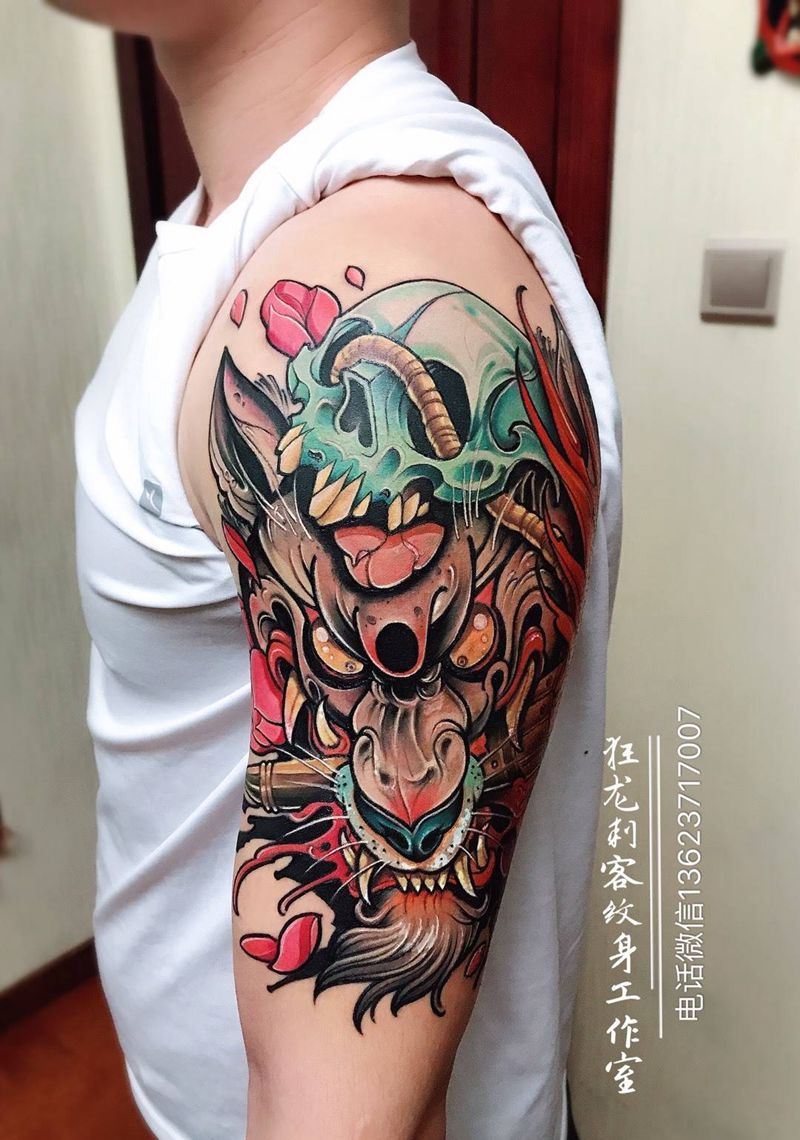 当前位置: 首页 >河南省郑州市纹身店-狂龙刺客纹身工作室纹身图案>狼头纹身图片_手臂肩部水彩New SchoolNew school狼头狼头狼纹身图案