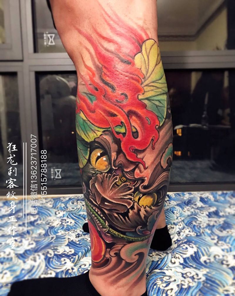 • T网红王老大花腿龙纹身图片_腿部新传统纹身图案