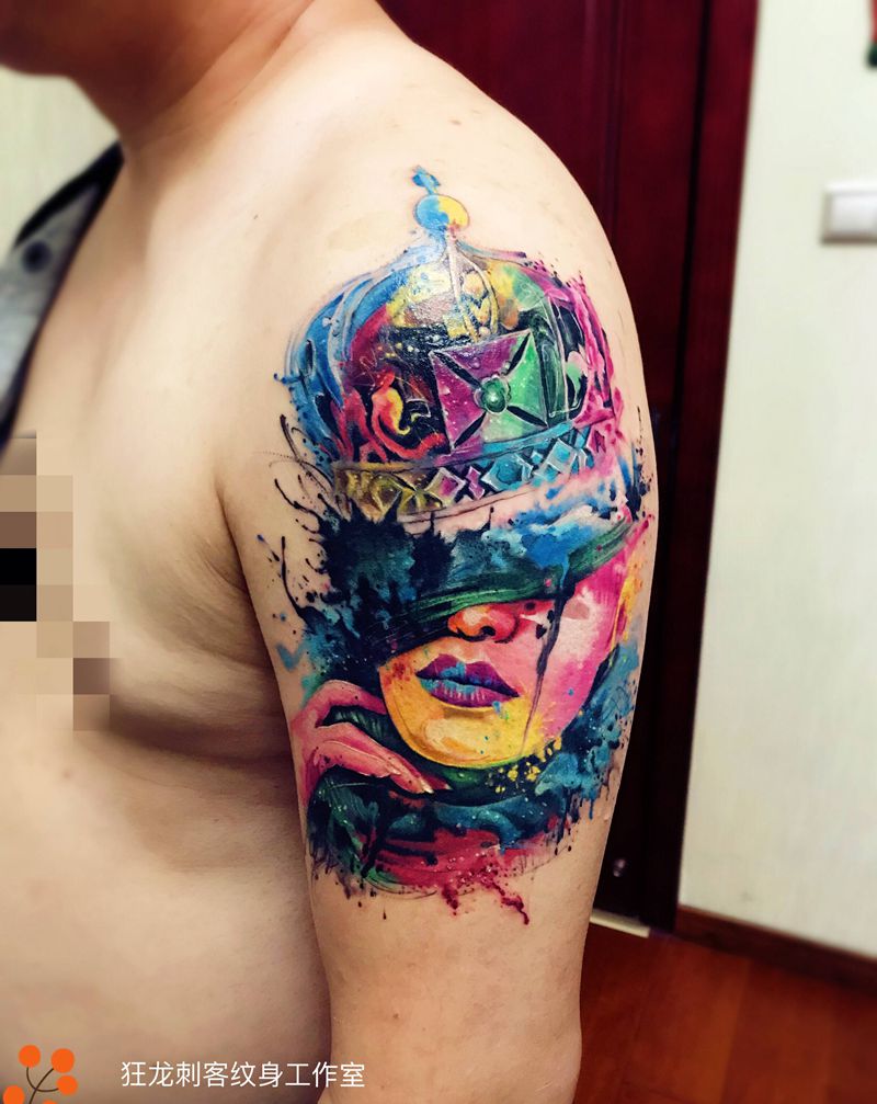 当前位置: 首页 >河南省郑州市纹身店-狂龙刺客纹身工作室纹身图案>遮盖纹身图片_手臂肩部New School水彩遮盖欧美人物水彩泼墨纹身图案