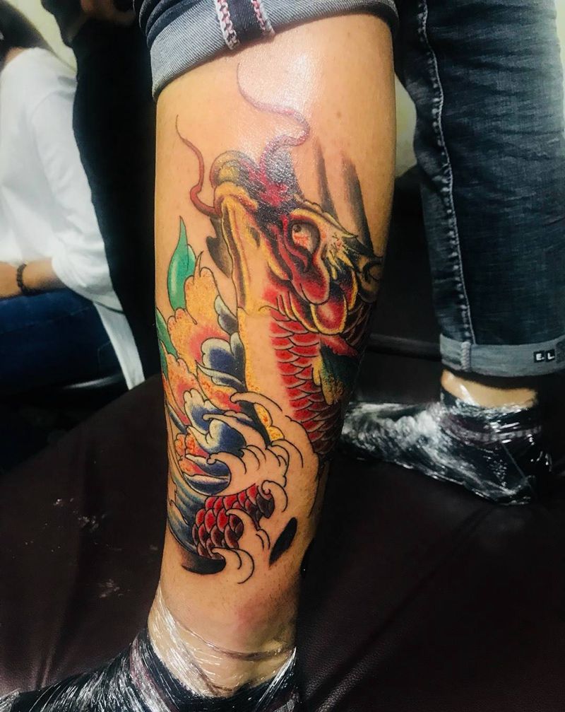 • T网红王老大花腿龙纹身图片_腿部新传统纹身图案