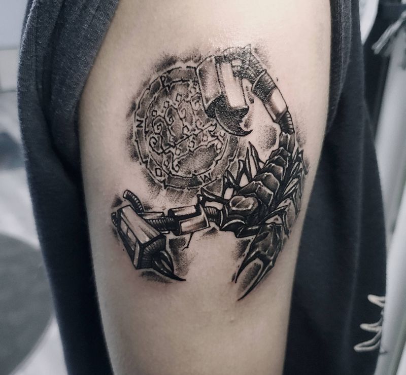 当前位置: 首页 >河南省郑州市纹身店-郑州岁岁刺青纹身图案>原创蝎子纹身图片_手臂肩部欧美写实图腾暗黑蝎子图腾纹身图案