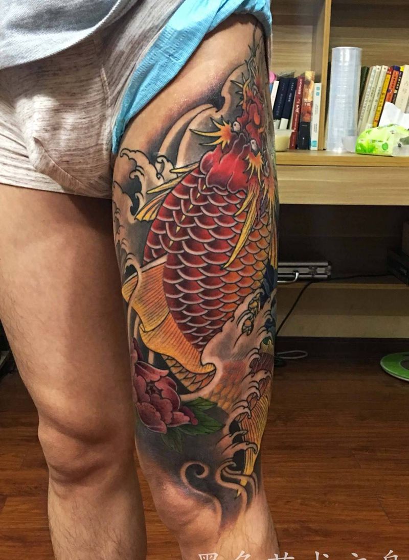 • T网红王老大花腿龙纹身图片_腿部新传统纹身图案