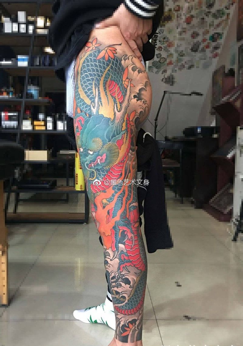 • T网红王老大花腿龙纹身图片_腿部新传统纹身图案
