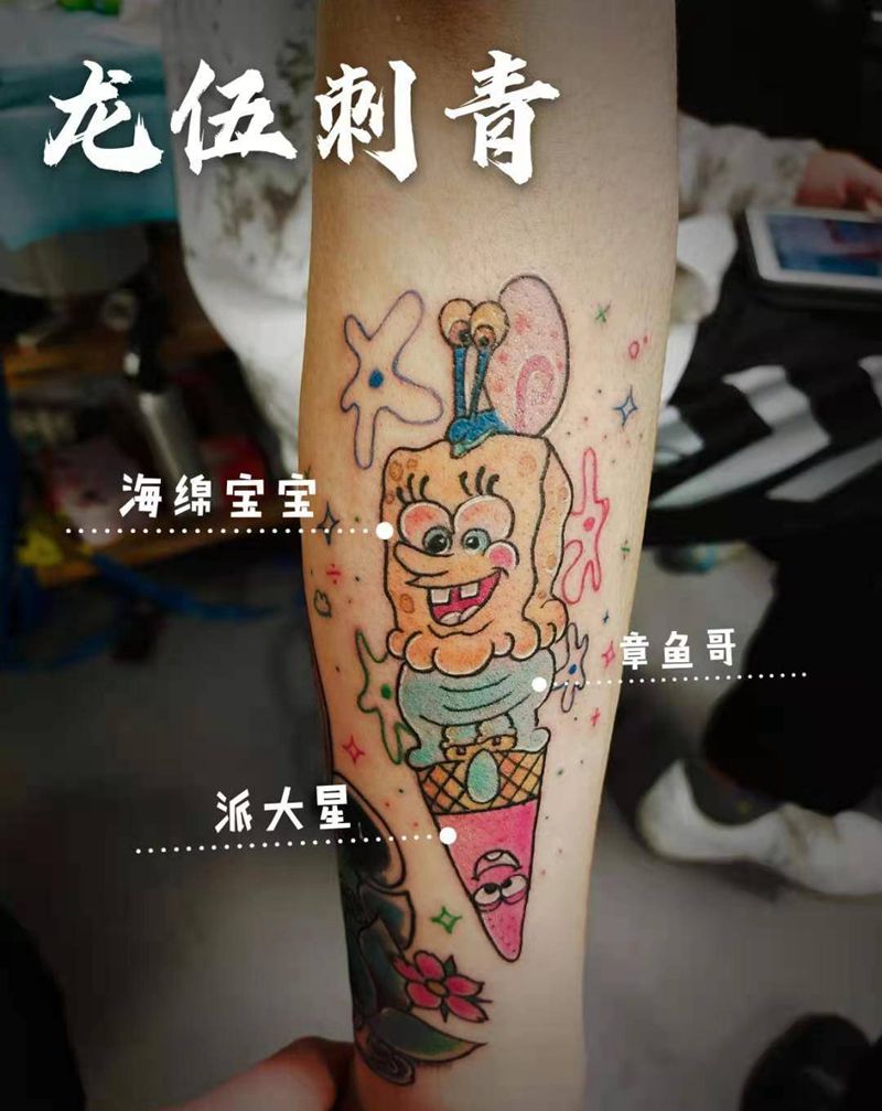 当前位置: 首页 >河南省郑州市纹身店-龙伍刺青纹身图案>海绵宝宝章鱼哥派大星纹身图片_手臂Old School纹身图案