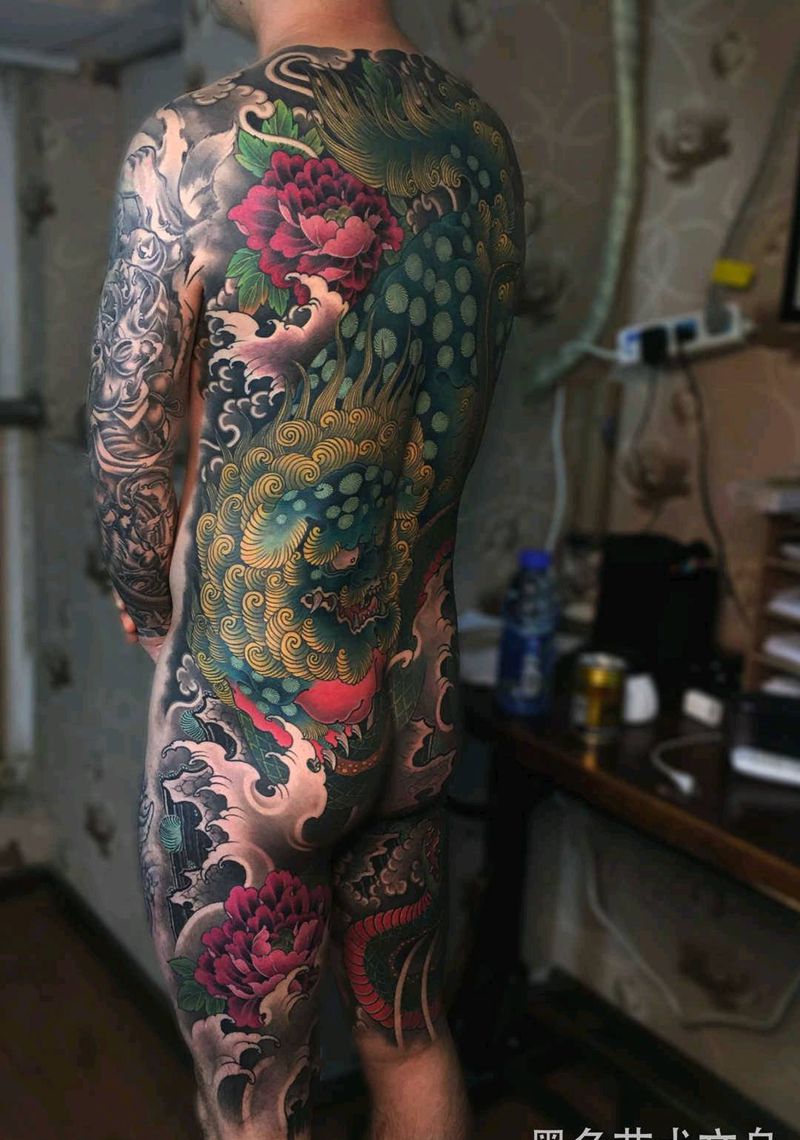 彩色唐狮,满背到大腿纹身图片_臀部腰部新传统唐狮,牡丹纹身图案