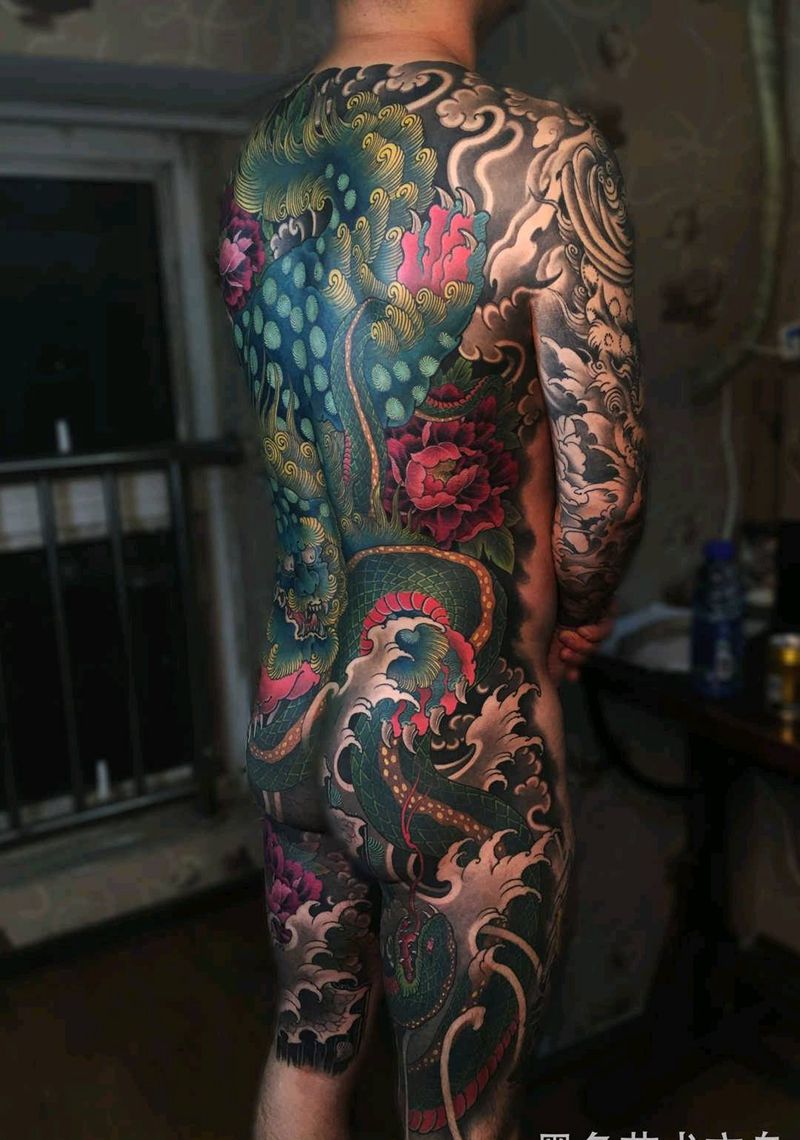 彩色唐狮,满背到大腿纹身图片_臀部腰部新传统唐狮,牡丹纹身图案