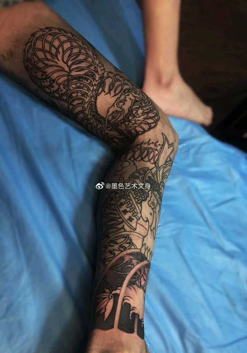 • T网红王老大花腿龙纹身图片_腿部新传统纹身图案