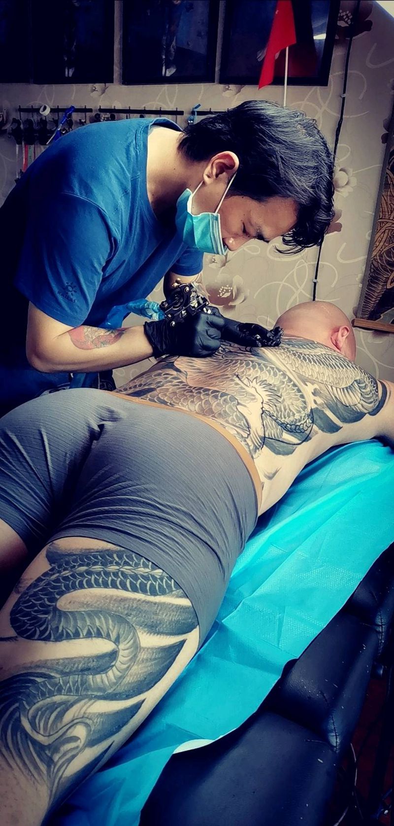 当前位置: 首页 >河南省郑州市纹身店-墨色刺青纹身图案>满背龙修改纹身图片_背部腿部新传统龙纹身图案