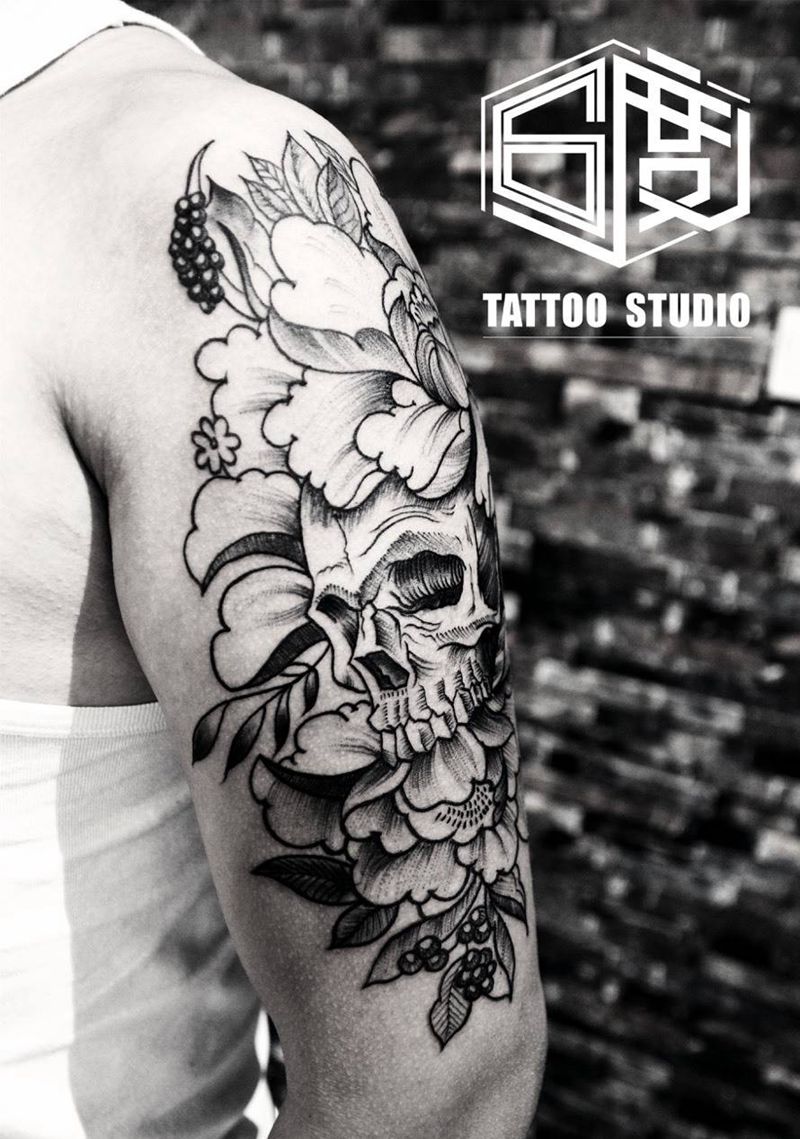 当前位置: 首页 >河南省郑州市纹身店-六度刺青纹身图案>骷髅与花 客人自带图纹身图片