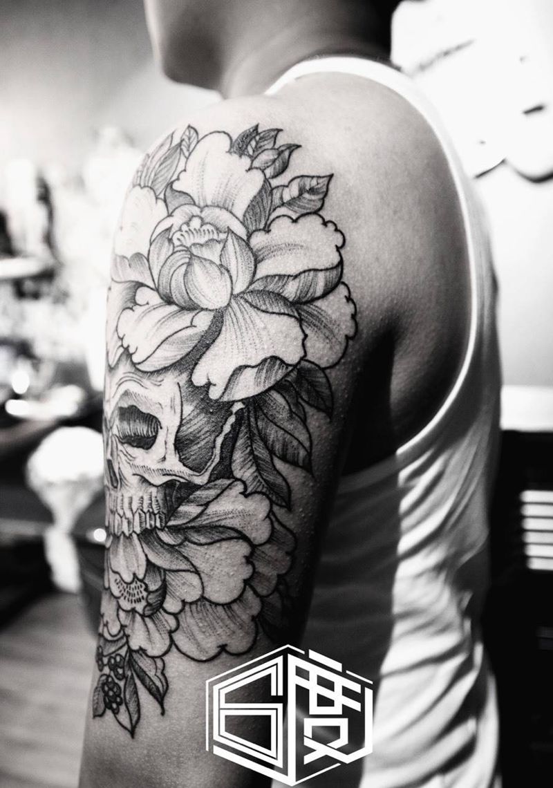 当前位置: 首页 >河南省郑州市纹身店-六度刺青纹身图案>骷髅与花 客人自带图纹身图片