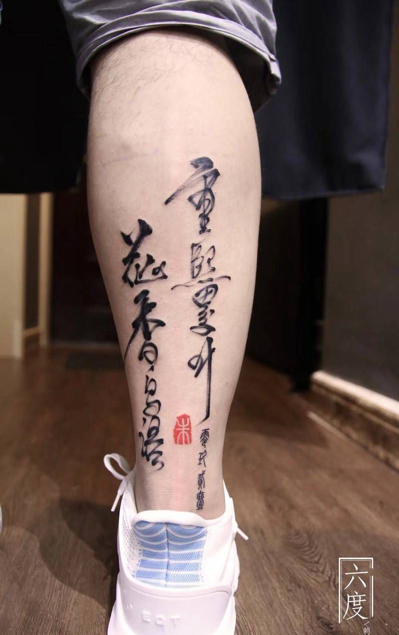 当前位置: 首页 >河南省郑州市纹身店-六度刺青纹身图案>原创毛笔字纹身图片_成品传统国画字符原创图腾腿部纹身图案