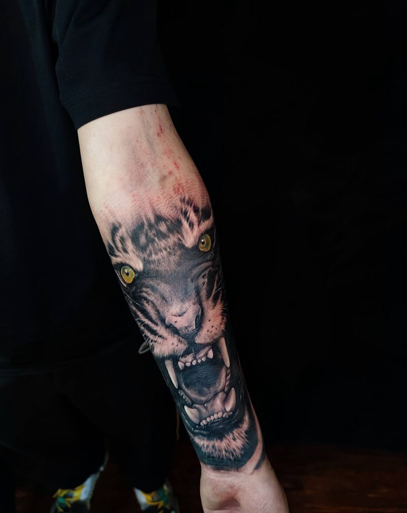 当前位置: 首页 >河南省郑州市纹身店-郑州黑刺刻工作室纹身图案>写实老虎纹身图片_手臂腿部欧美写实纹身图案