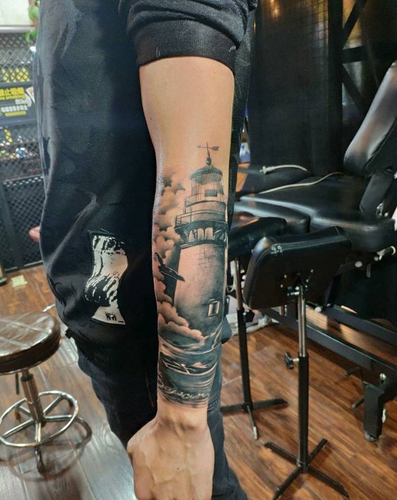 当前位置: 首页 >河南省郑州市纹身店-郑州黑刺刻工作室纹身图案>小臂写实灯塔。纹身图片