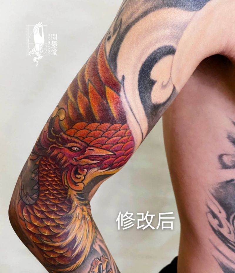 当前位置: 首页 >河南省郑州市纹身店-豫H~林刺青纹身图案>凤凰花臂修改上色纹身图片_手臂新传统纹身图案