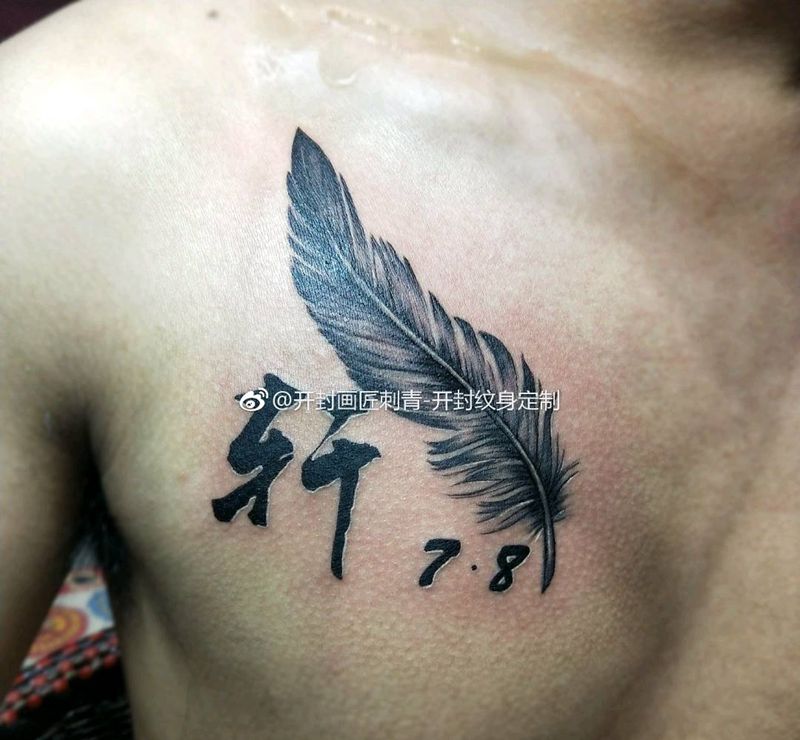 羽毛与字纹身图片_胸部欧美写实水墨羽毛字体纹身图案