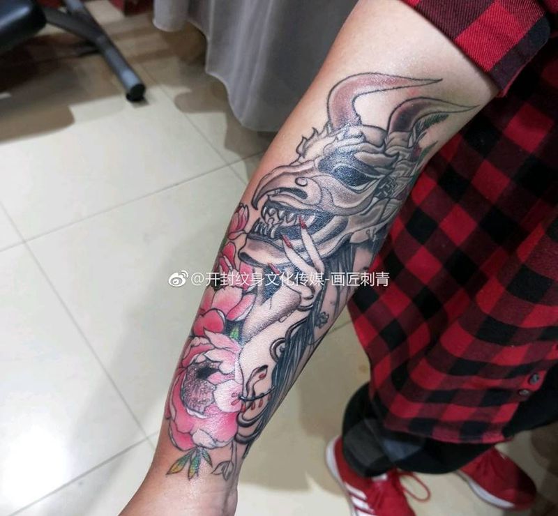当前位置: 首页 >河南省开封市纹身店-画匠刺青纹身图案>艺妓未完成纹身图片_手臂手部新传统艺妓面具般若纹身图案