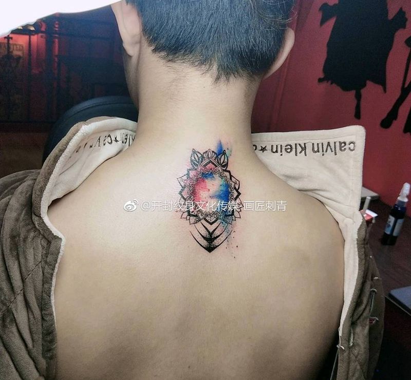 泼墨+姓氏设计纹身图片_颈部背部水墨点刺纹身图案