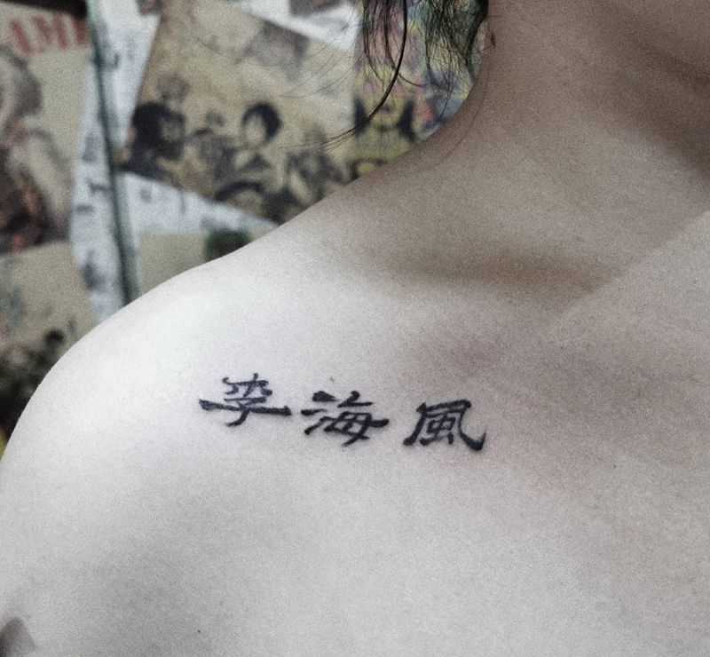 当前位置: 首页 >河南省开封市纹身店-画匠刺青纹身图案>书法纹身图片_肩部手臂水墨书法毛笔字名字纹身图案
