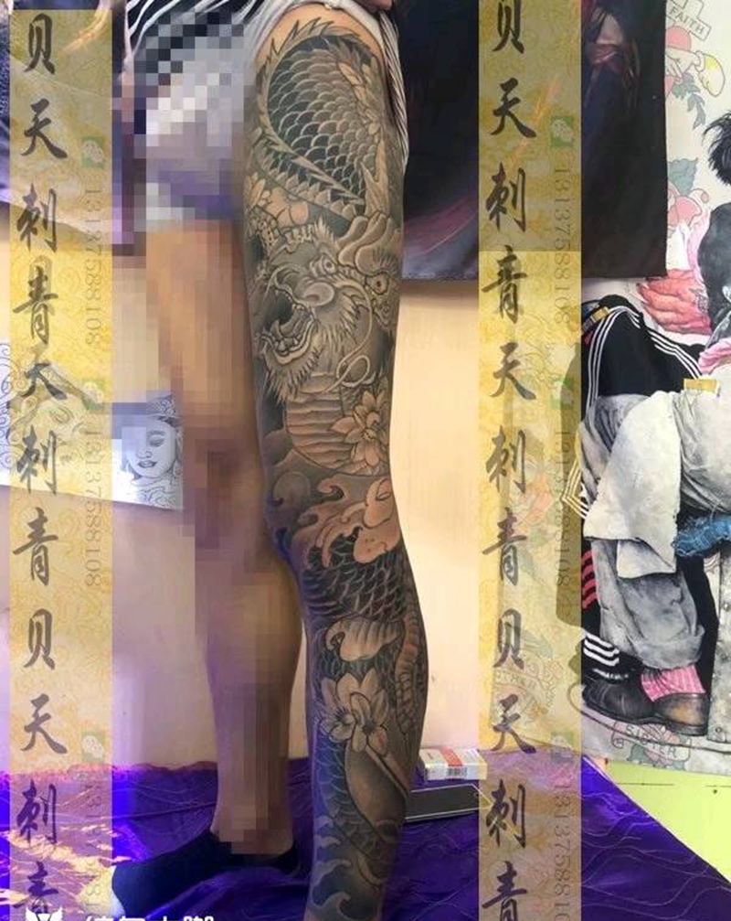 • T网红王老大花腿龙纹身图片_腿部新传统纹身图案
