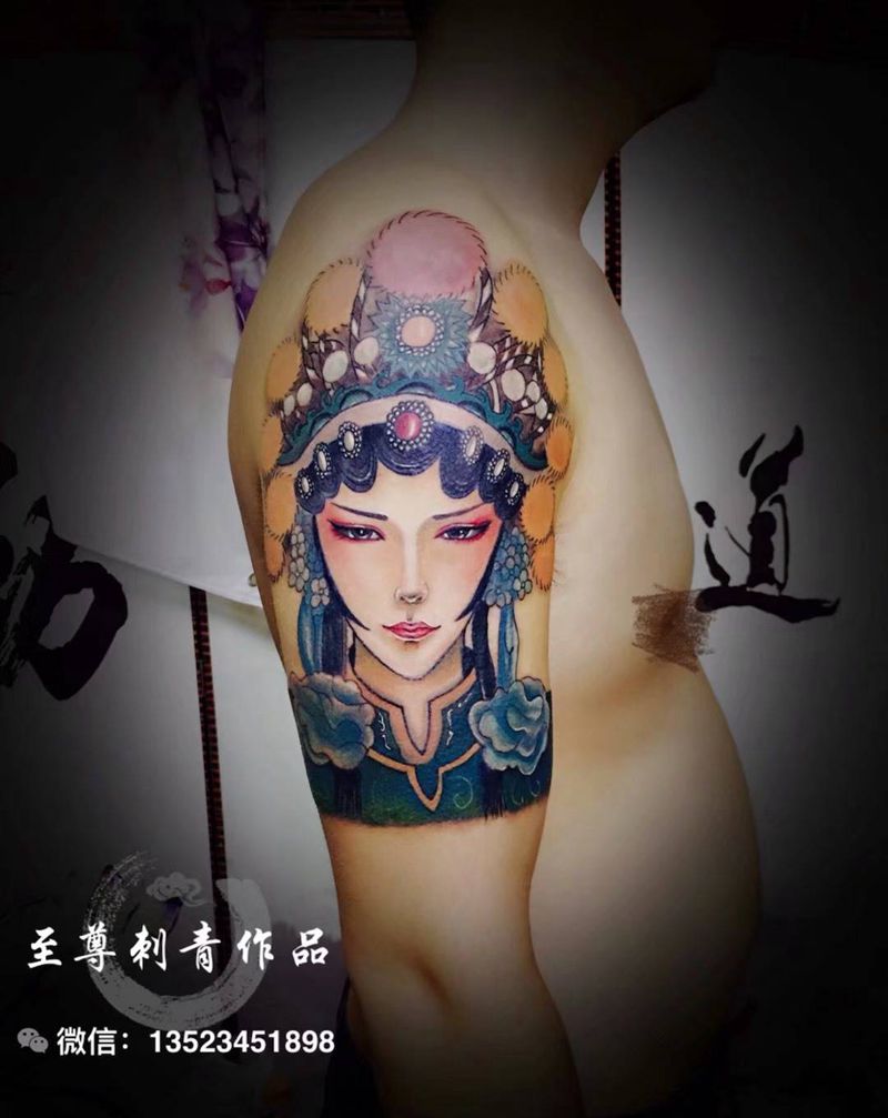 当前位置: 首页 >河南省郑州市纹身店-至尊刺青纹身图案>花旦纹身图片_手臂新传统纹身图案