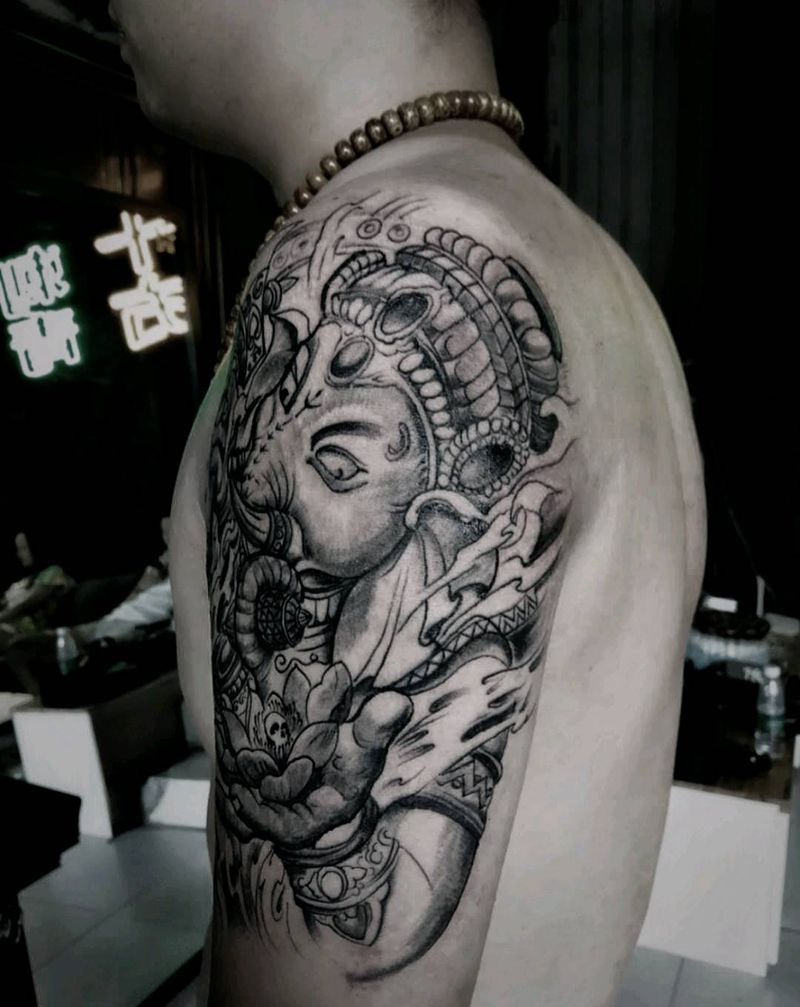 当前位置: 首页 >河南省郑州市纹身店-十方刺青纹身图案>象神纹身图片_手臂新传统纹身图案