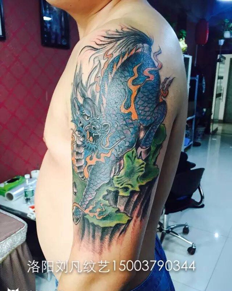 • T网红王老大花腿龙纹身图片_腿部新传统纹身图案
