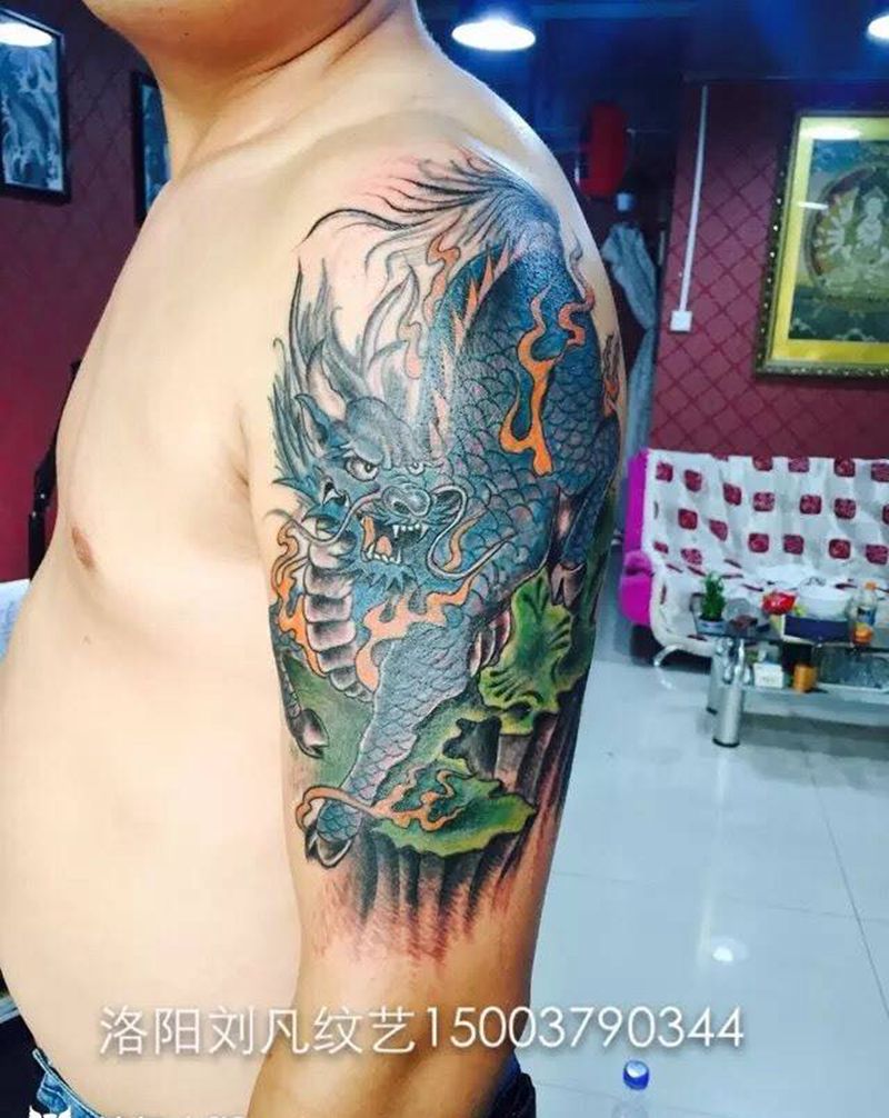 • T网红王老大花腿龙纹身图片_腿部新传统纹身图案