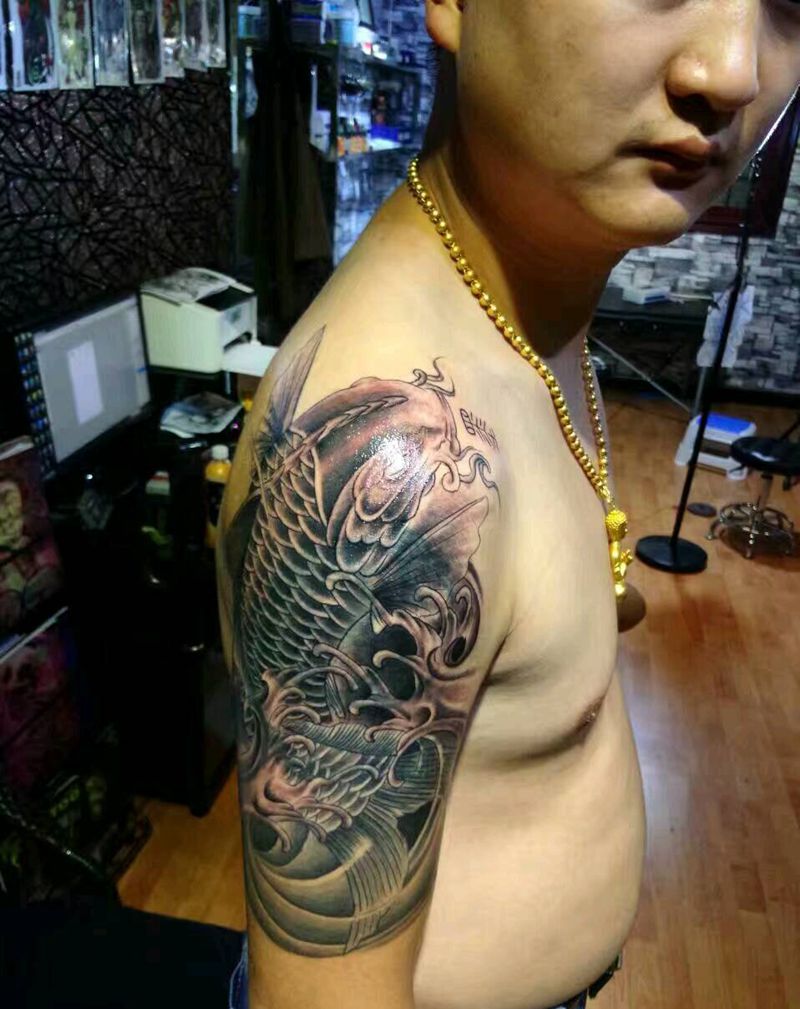 锦鲤掩盖纹身图片_肩部传统动物成品纹身图案