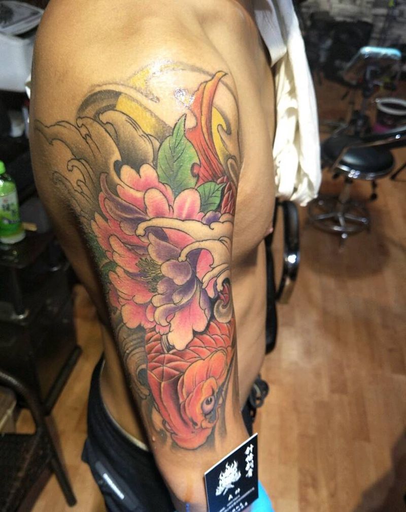 彩色锦鲤纹身图片_肩部传统动物成品纹身图案
