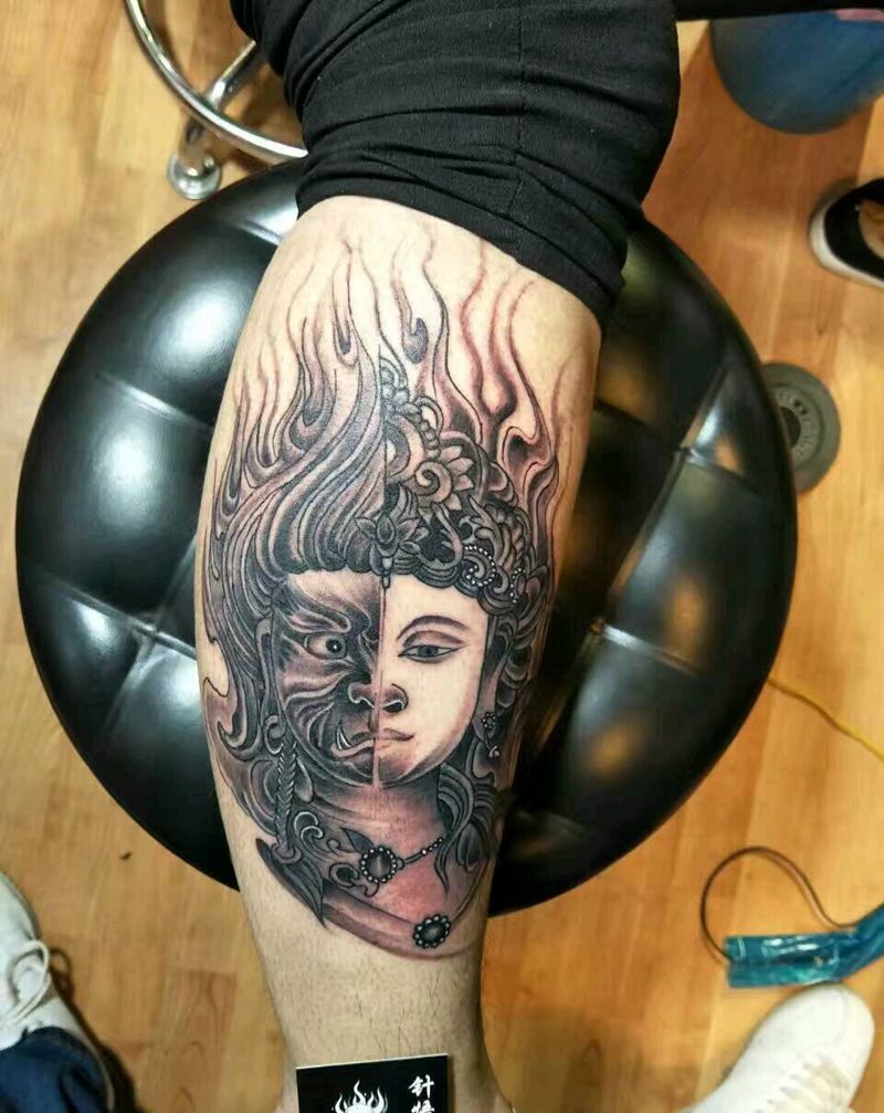 半佛半魔纹身图片_腿部传统人物成品纹身图案