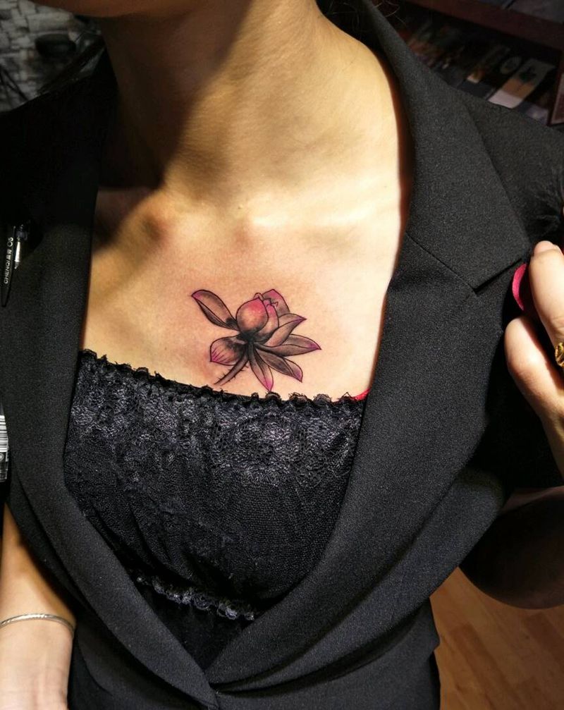 荷花掩盖伤疤纹身图片_胸部清新植物成品纹身图案