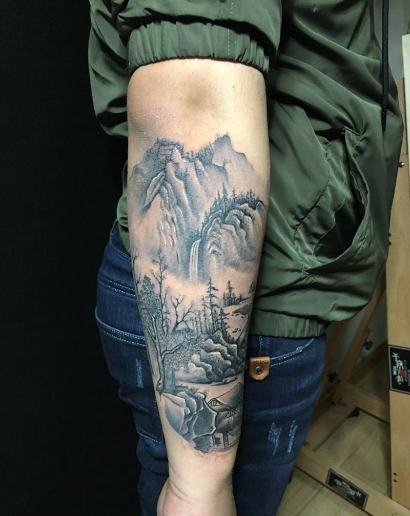 山水画包小臂,一侧完成细节太多,明天继续纹身图片_成品颈部肩部腹部手臂传统欧美清新字符植物纹身图案