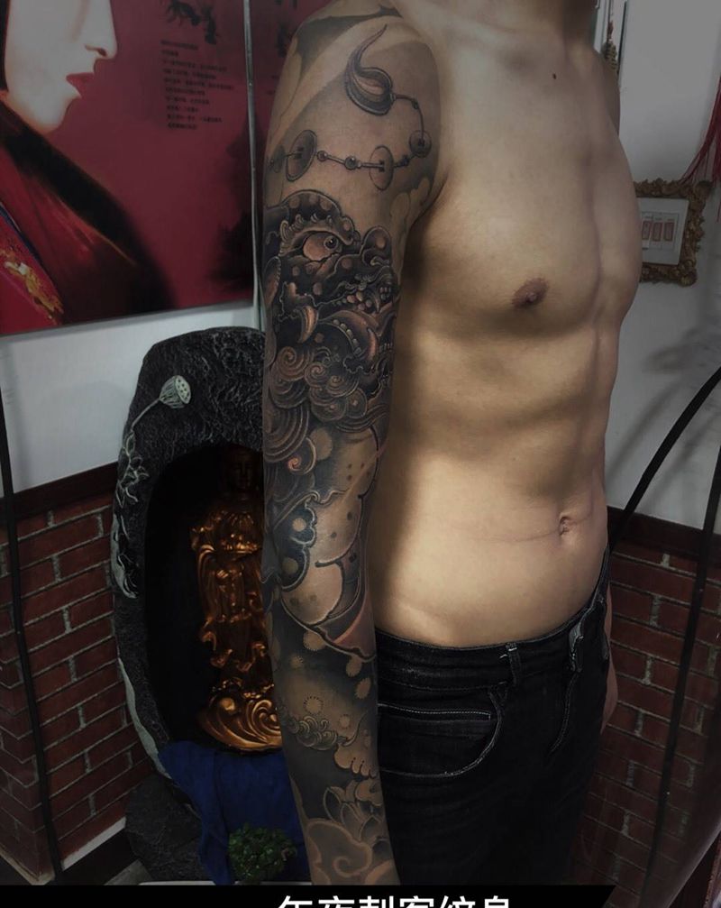 福狮黑灰花臂纹身图片_成品手臂动物原创传统颈部腰部习俗纹身图案