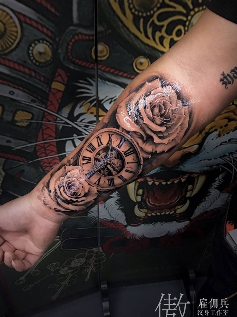 当前位置: 首页 >河南省洛阳市纹身店-Y刺青纹身工作室纹身图案>小臂玫瑰钟表纹身图片_手臂欧美写实玫瑰钟表时钟纹身图案