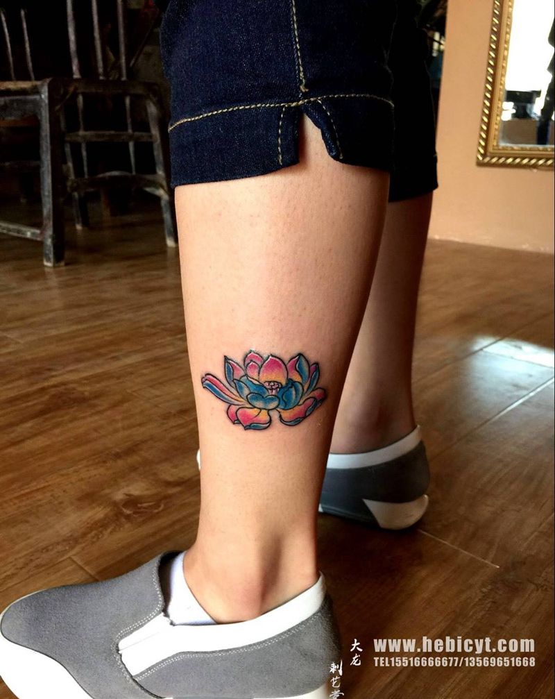当前位置: 首页 >河南省鹤壁市纹身店-刺艺堂—刺道纹身图案>荷花纹身图片_成品腿部写实清新植物纹身图案