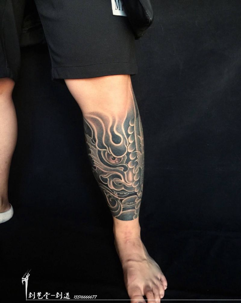 当前位置: 首页 >河南省鹤壁市纹身店-刺艺堂—刺道纹身图案>刺艺堂-刺道老师接小腿~纹身图片_成品臀部腿部传统鬼神图腾动物国画宗教原创纹身图案