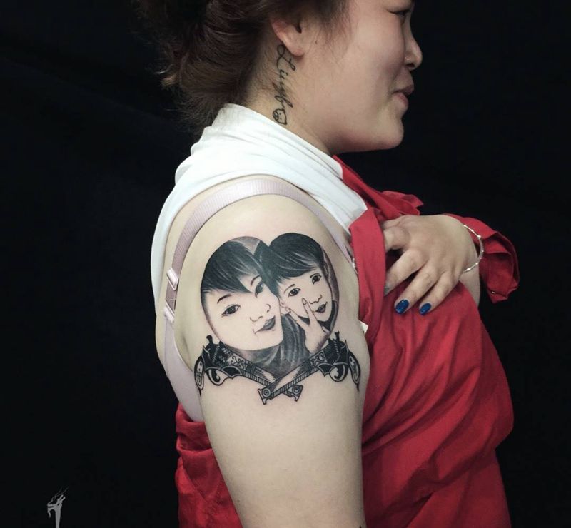 当前位置: 首页 >河南省鹤壁市纹身店-刺艺堂—刺道纹身图案>收图喽 你和孩子 下面还盖老刺青~[机智]纹身图片