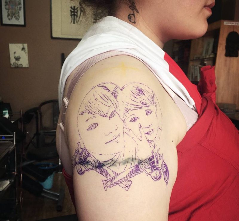 当前位置: 首页 >河南省鹤壁市纹身店-刺艺堂—刺道纹身图案>收图喽 你和孩子 下面还盖老刺青~[机智]纹身图片