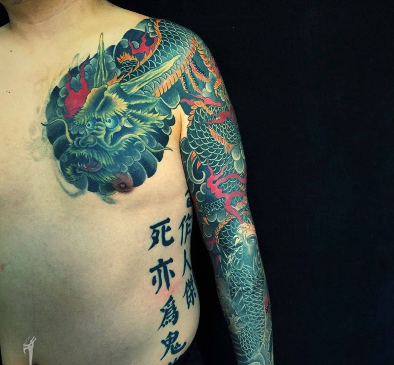 • T网红王老大花腿龙纹身图片_腿部新传统纹身图案