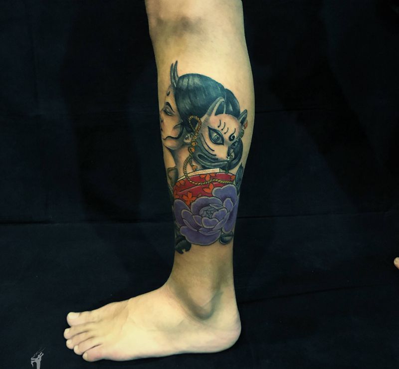• T包小腿吹火男+阿多福纹身图片_腿部老传统新传统吹火男阿