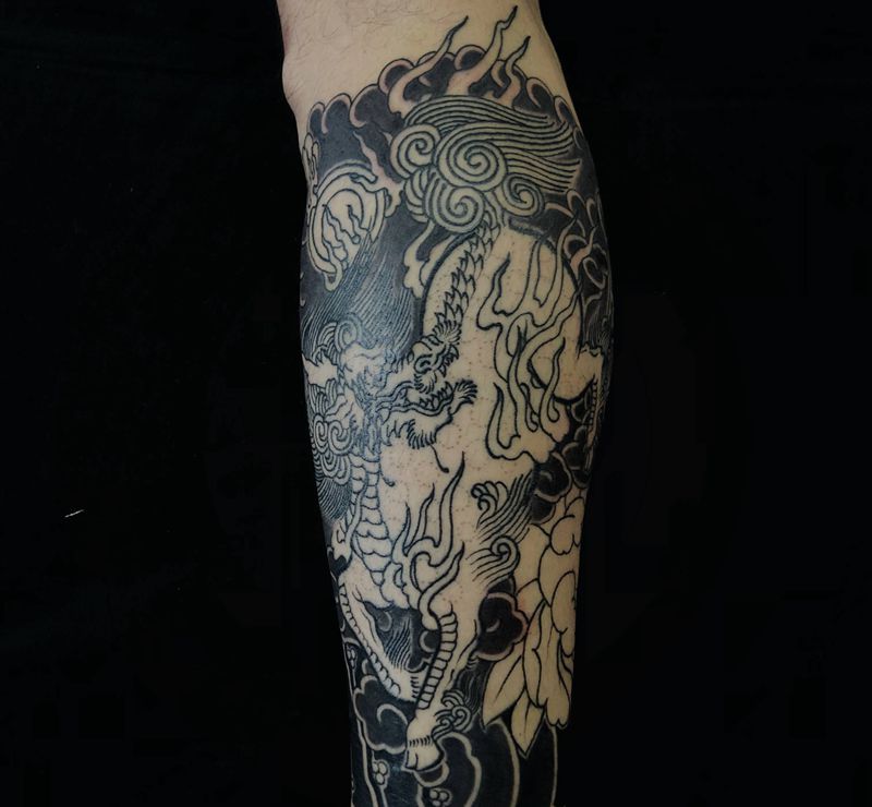 • T网红王老大花腿龙纹身图片_腿部新传统纹身图案
