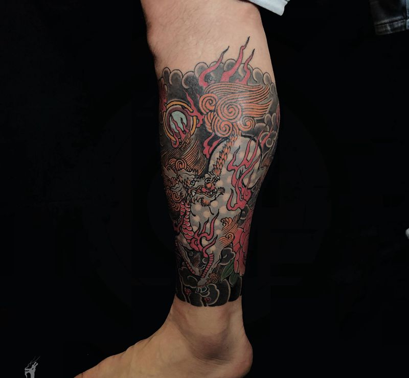 • T网红王老大花腿龙纹身图片_腿部新传统纹身图案