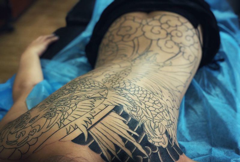 • T网红王老大花腿龙纹身图片_腿部新传统纹身图案