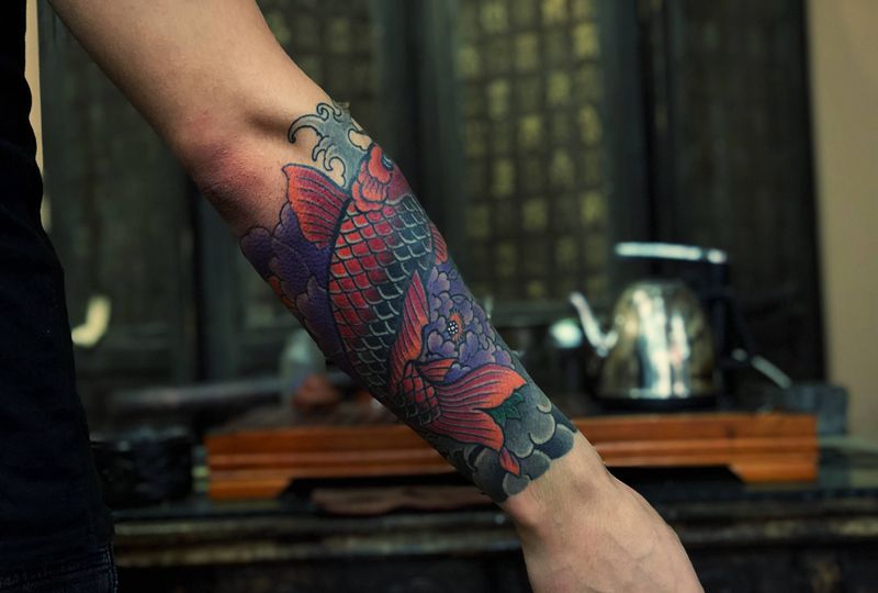 当前位置: 首页 >河南省鹤壁市纹身店-刺艺堂—刺道纹身图案>锦鲤强势盖~纹身图片_老传统纹身图案