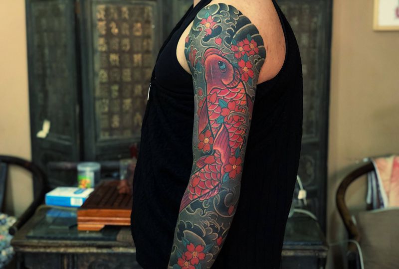 当前位置: 首页 >河南省鹤壁市纹身店-刺艺堂—刺道纹身图案>锦鲤覆盖恢复中~纹身图片_老传统纹身图案