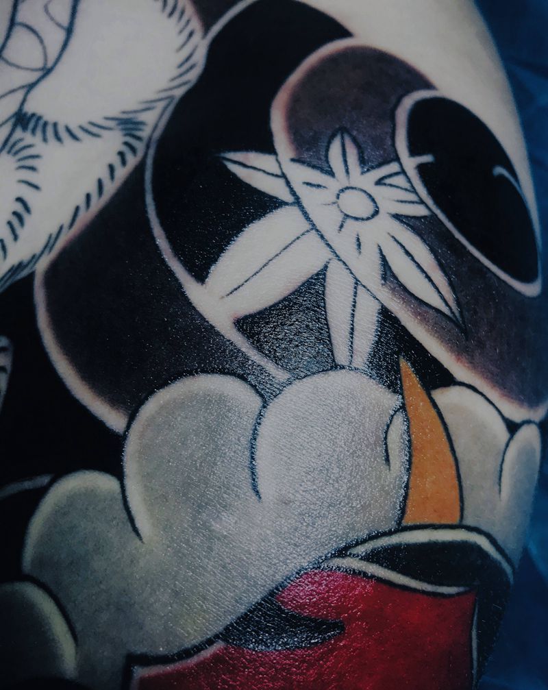 • T包小腿吹火男+阿多福纹身图片_腿部老传统新传统吹火男阿